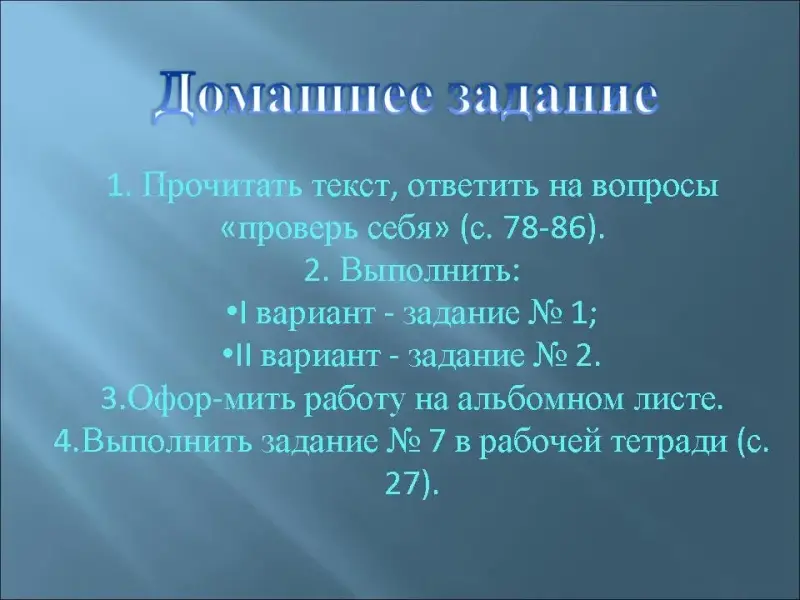 Прочитать текст, ответить на вопросы "проверь себя" (с. 78-86). Выполнить: I вариант - задание № 1; II вариант - задание № 2. Оформить работу на альбомном листе.