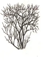 Кора старых стволов темно-серая, иногда темно-бурая, с частыми белыми чечевичками | Молодые побеги буроватые, рыжеватые или красновато-бурые, Старые побеги голые, ребристые | Почки располагаются супротивно, голые, яйцевидные, острые, с вишнёвым оттенком или зеленоватые. Побеги заканчиваются обычно одной почкой, более крупной, чем боковые. | «На листочках там и тут фиолетовый салют. Это в тёплый майский день распускается» |