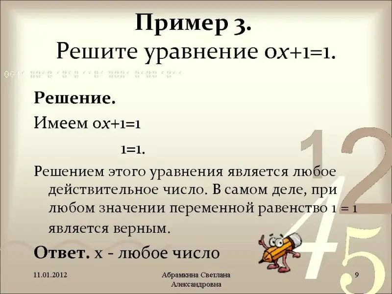 1=1. Решением этого уравнения является любое действительное число. В самом деле, при