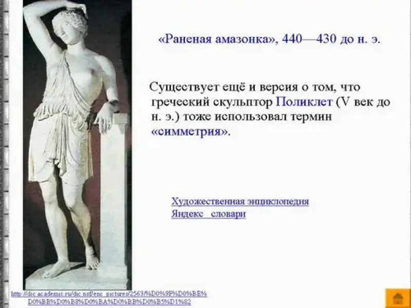 Далее с помощью презентации учащимся демонстрируется историческая справка о происхождении термина "симметрия".