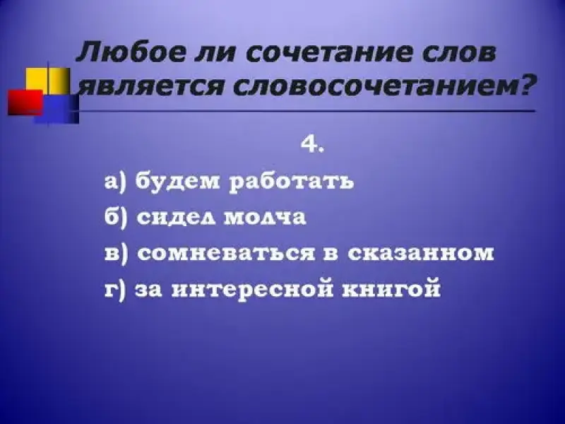 в) Слово учителя: Словосочетание служит для сложного наименования явлений объективной действительности, но, в отличие от слова, состоит из отчётливо выделяющихся слов-названий, в нём каждое слово оформлено отдельно, в слове же составные части - морфемы - слиты воедино: непроницаемый для воды - водонепроницаемый; в пять этажей - пятиэтажный. Отдельно взятое словосочетание не выражает никакого суждения, не передаёт и отношения говорящего к высказыванию, не имеет интонации, поэтому не выступает как единица общения. Словосочетание, как и слово, входит в состав предложения и служит для него строительным материалом.