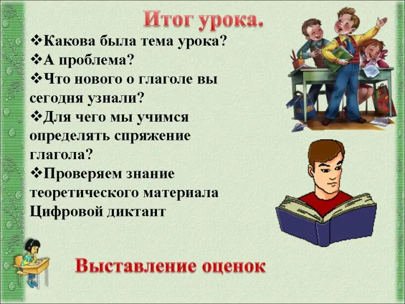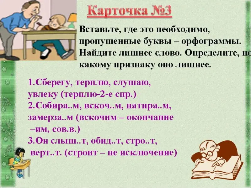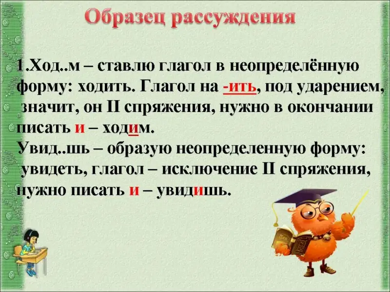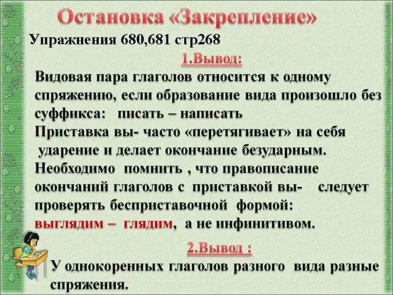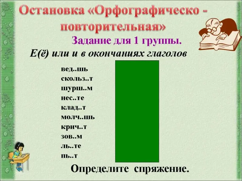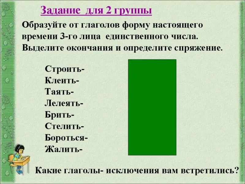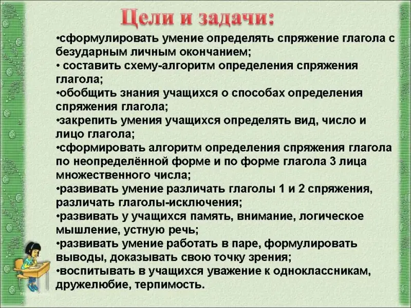 - развивать умение различать глаголы 1-го и 2-го спряжения, различать глаголы-исключения;