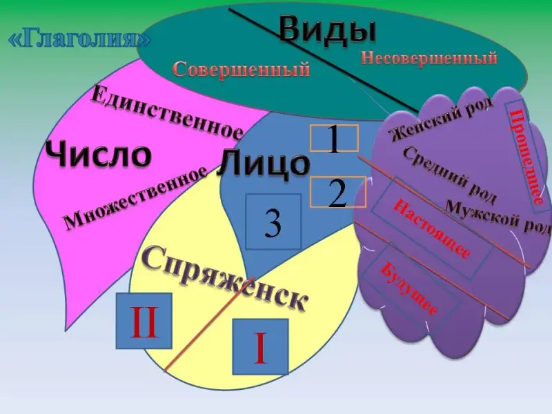 Здесь есть необыкновенные города с замечательными жителями, о которых мы говорили на прошлых уроках. Вот город Виды, разделенный на два района Совершенный и Несовершенный. А дальше расположены маленькие городки со своими микрорайонами: город Лицо с 1, 2, 3-мя микрорайонами, город Число с Единственным и Множественным микрорайонами, которые очень дружны с городами Глаголии, город Время со своими Прошедшим, Настоящим, Будущим микрорайонами. В прошедшем микрорайоне находится квартал Роды.
