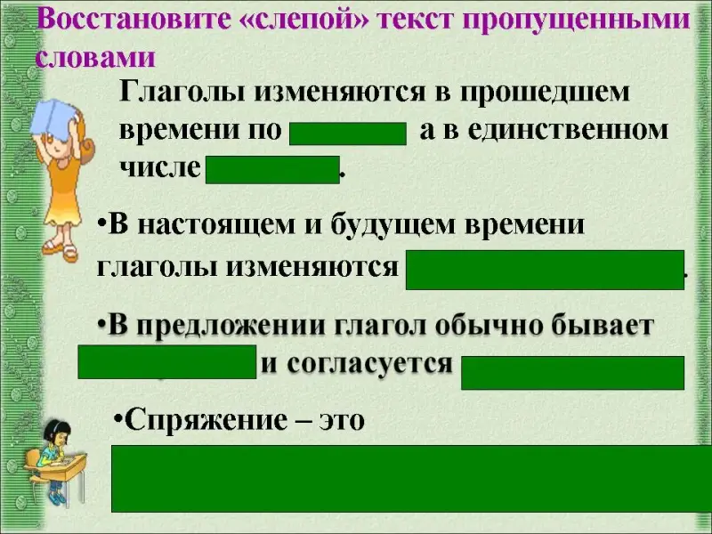 д) Глаголы изменяются в прошедшем времени по …(по числам), а в…(единственном) числе по … (родам). В настоящем и будущем времени глаголы изменяются по ... (числам и лицам).