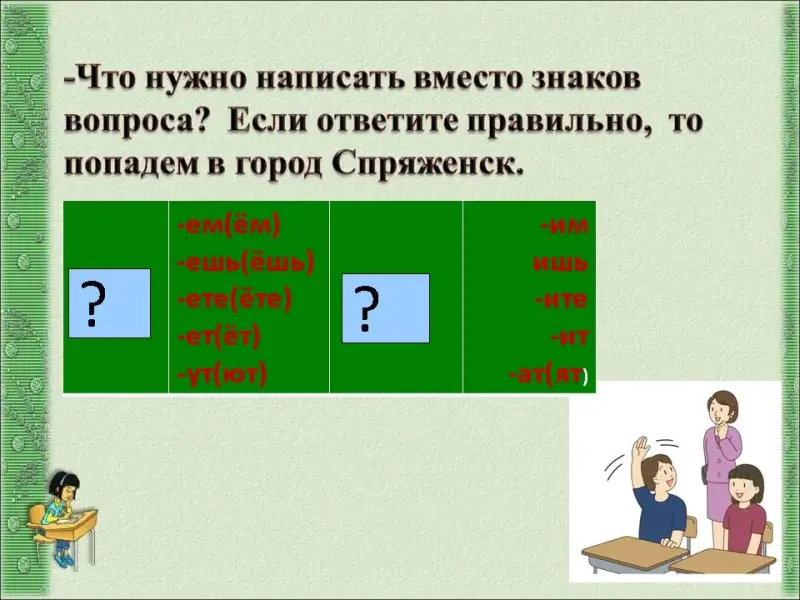 2) На доске схема. Что нужно написать вместо знаков вопроса? Если ответите правильно, то мы попадем в город Спряженск. (Слайд 7)