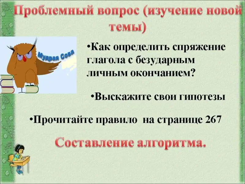 Цель урока: сформулировать умение определять спряжение глагола с безударным личным окончанием, составить схему-алгоритм определения спряжения глагола.