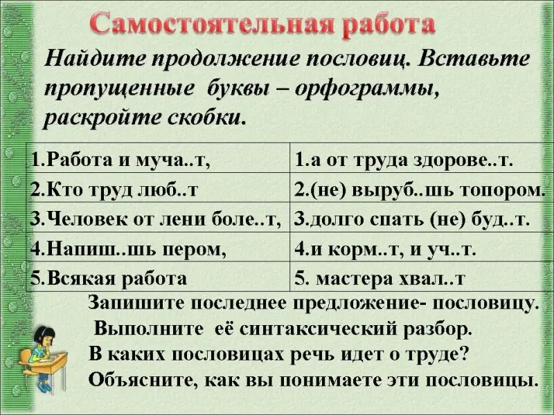 | 1. Работа и муча..т, | 1. а от труда здорове..т. |