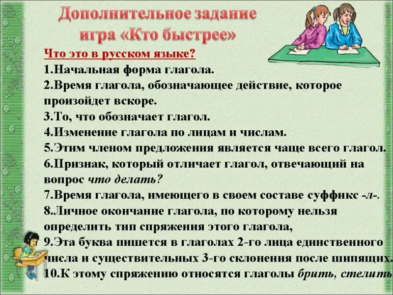 г) Глаголы в неопределенной форме имеют окончания …. (ть, ти, нулевое окончание в глаголах на чь).