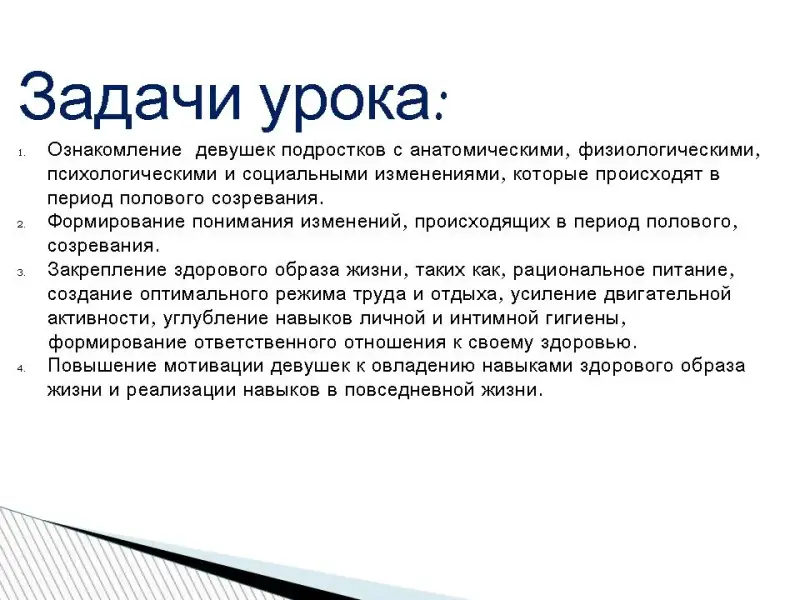 - Ознакомление девушек подростков с анатомическими, физиологическими, психологическими и социальными изменениями, которые происходят в период полового созревания.