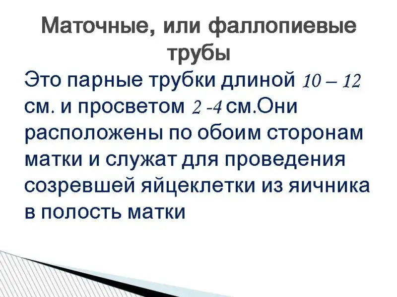 Маточные трубы (фаллопиевы трубы) - это парный орган, состоящий из двух трубкообразных тел, который соединяет полость матки с брюшной полостью. Они берут начало от границы матки в районе ее дна и заканчиваются возле яичников; одно завершение трубы (один конец трубы) переходит в матку, другой - в брюшную полость. По фаллопиевым трубам яйцеклетка проталкивается из брюшной полости в матку.