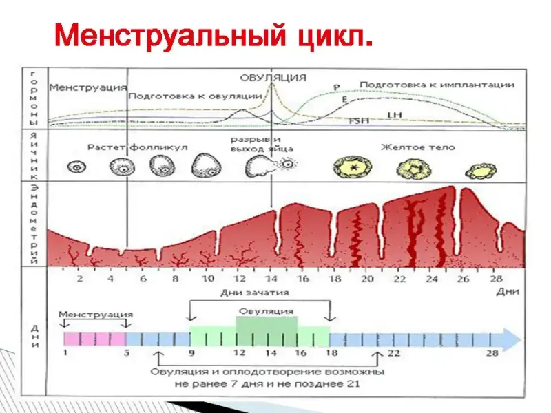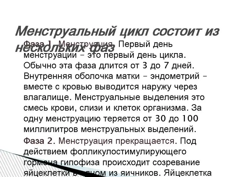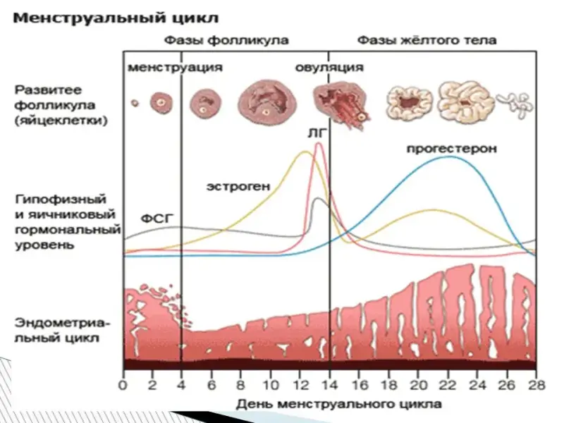В яичниках выделяют фазы: фолликулярную; овуляторную; лютеиновую. В матке выделяют фазы: менструальная; пролиферативная; секреторная. Фолликулярная фаза. Фолликулярная фаза начинается с первого дня новой менструации и продолжается половину менструального цикла до овуляции (выхода новой яйцеклетки). Под действием гормонов гипоталамуса и гипофиза (отделы головного мозга) в одном из яичников начинают расти фолликулы с яйцеклетками, из которых созревает только один (реже два). Эта часть цикла называется фолликулярной фазой и занимает примерно первую половину менструального цикла, однако у разных женщин продолжительность ее может быть различной. Имеется целый ряд причин, влияющих на срок наступления овуляции: стрессы; путешествия; переезды; болезнь; индивидуальные особенности организма В первые 3-5 дня этой фазы в матке происходит десквамация эпителия (менструация). Менструация - вовсе не выброс "испорченной" крови. На самом деле, выделения содержат весьма небольшие количества крови, смешанной со слизью и тканью слизистой оболочки матки. Количество крови, теряемое во время менструации, у разных женщин различно, но в среднем не превышает 5-8 столовых ложек. После того как эпителий отторгается, начинается рост нового эпителия и подготовка стенок матки к принятию новой яйцеклетки в случае ее оплодотворения. Это происходит до момента овуляции новой яйцеклетки. Овуляторная фаза. Приблизительно к 7-му дню менструального цикла в яичнике определяется доминантный фолликул, который продолжает расти и секретирует увеличивающееся количество эстрадиола, в то время как остальные фолликулы подвергаются обратному развитию. Достигнувший зрелости и способный к овуляции фолликул называется граафовым пузырьком. Во время овуляторной фазы, которая длится около 3 дней, происходит выброс лютеинизирующего гормона (ЛГ). В течение 36-48 ч происходит несколько волн высвобождения ЛГ, значительно увеличивается его концентрация в плазме. Выброс ЛГ завершает развитие фолликула, стимулирует продукцию простагландинов и протеолитических ферментов, необходимых для разрыва стенки фолликула и высвобождения зрелой яйцеклетки (собственно овуляция). В то же время снижается уровень эстрадиола, что иногда сопровождается овуляторным синдромом. Овуляция обычно происходит в ближайшие 24 ч. после наиболее крупной волны выброса ЛГ (от 16 до 48 ч). Во время овуляции высвобождается 5-10 мл фолликулярной жидкости, в которой содержится яйцеклетка. Лютеиновая фаза. Промежуток времени между овуляцией и началом менструального кровотечения называется лютеиновой фазой цикла (также известна как фаза желтого тела). В отличие от фолликулярной фазы, длительность лютеиновой более постоянная: 13-14 дней (±2 дня). После разрыва граафова пузырька стенки его спадаются, его клетки накапливают липиды и лютеиновый пигмент, это придает ему желтый цвет. Трансформированный граафов фолликул теперь называется желтым телом. Продолжительность лютеиновой фазы зависит от периода функционирования (10-12 дней) желтого тела, в это время желтое тело секретирует прогестерон, эстрадиол и андрогены. Повышенный уровень эстрогена и прогестерона изменяет характеристику двух наружных слоев эндометрия. Железы эндометрия созревают, пролиферируют и начинают секретировать(секреторная фаза), матка готовится