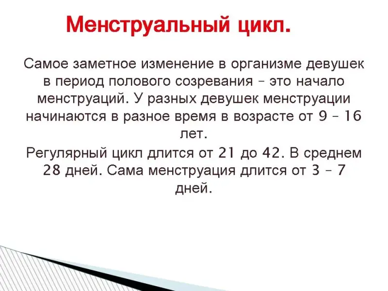 Когда они начнутся и закончатся? Менструации начинаются в период полового созревания и прекращаются с наступлением климакса. За последние годы средний возраст, когда начинается менструальный цикл, снизился до 11-13 лет, тогда как у наших прабабушек первая менструация отмечалась в 15-16 лет. За последние 100 лет сдвинулся и возраст наступления климакса: с 47 до 52 лет. Продолжительность менструального цикла у разных женщин неодинакова: чаще всего длительность его совпадает с лунным циклом - 28 дней, но встречается менструальный цикл и от 21-го до 30-ти, реже 35-ти дней. Иногда наблюдается чередование короткого цикла с более длинным через один. Длительность менструального цикла определяют от первого дня наступившей менструации до первого дня следующей менструации.