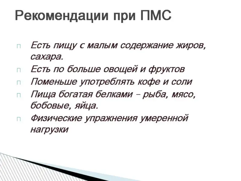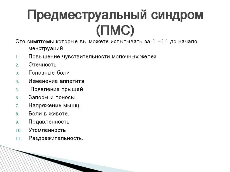 Кроме того, нарушения менструального цикла могут быть спровоцированы избыточными физическими и психологическими нагрузками, изнуряющими диетами, резкой сменой климата. Предместруальный синдром (ПМС). Это симптомы, которые вы можете испытывать за 1-14 до начало менструаций: Повышение чувствительности молочных желез,отечность, головные боли. изменение аппетита, появление прыщей, запоры и поносы, напряжение мышц, боли в животе, подавленность, утомленность, раздражительность Рекомендации при ПМС.