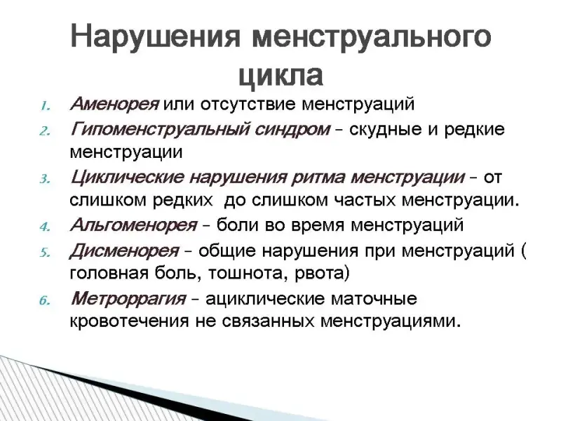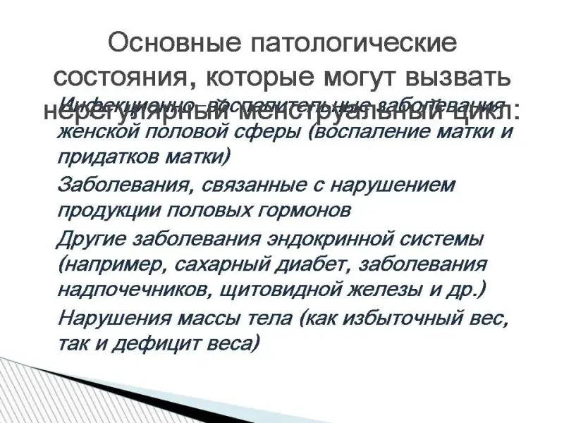 "Задержка менструального цикла" - этим термином обычно обозначают ненаступление в свой срок очередной менструации у женщины с предшествующим регулярным менструальным циклом. Основная причина "задержки менструации" - наступление беременности. Но существует и множество патологических состояний, не связанных с беременностью, которые могут впервые проявлять себя именно "задержкой менструации", поэтому любое отклонение от нормального менструального цикла - повод для визита к врачу. Основные патологические состояния, которые могут вызвать нерегулярный менструальный цикл: 1. Инфекционно-воспалительные заболевания женской половой сферы (воспаление матки и придатков матки).