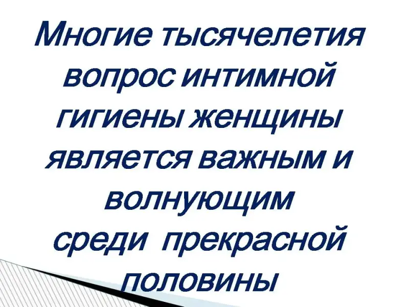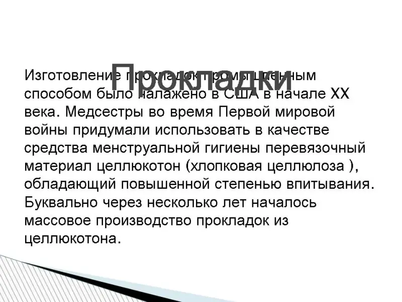 Личная и интимная гигиена. Многие тысячелетия вопрос интимной гигиены женщины является важным и волнующим среди прекрасной половины человечества. Как выбрать средство для интимной гигиены? Прокладки. Изготовление прокладок промышленным способом было налажено в США в начале XX века. Медсестры во время Первой мировой войны придумали использовать в качестве средства менструальной гигиены перевязочный материал целлюкотон (хлопковая целлюлоза ), обладающий повышенной степенью впитывания. Буквально через несколько лет началось массовое производство прокладок из целлюкотона. Гигиена тела. Во время менструации (критические дни) интимной гигиене следует уделять особое внимание. В эти дни половые органы особенно восприимчивы к инфекции в связи с некоторым снижением защитных сил организма. Кровь - идеальная среда для жизни и размножения бактерий. Соблюдайте чистоту.