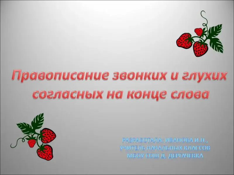 Цели: формировать умение проверять написание парных согласных на конце слова; учить применять полученные знания грамотного письма и самостоятельной работы; прививать интерес и любовь к русскому языку.
