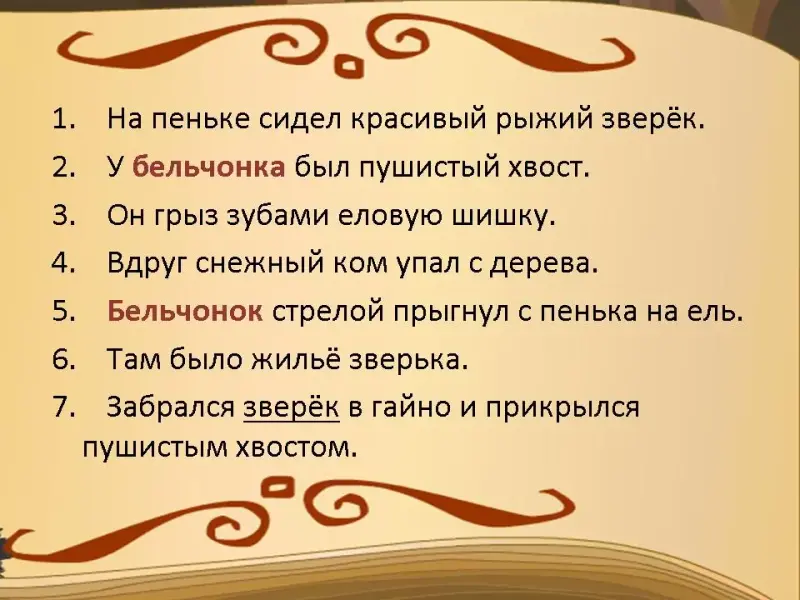 Слайд 33-34. - Замените во 2 предложении слово зверек, так, чтобы стало ясно о каком зверьке идет речь (бельчонок).