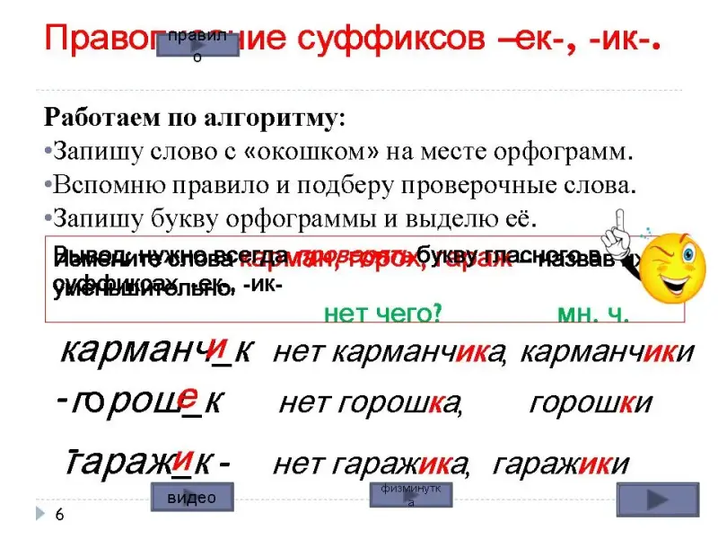 Переход в 6-м слайде по ссылке "видео" Мультипликационный ролик "Суффиксы -ек, -ик" Приложение 2.