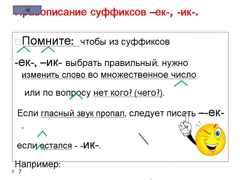 2. Слайд 6. Правописание суффиксов -ек-, -ик-.