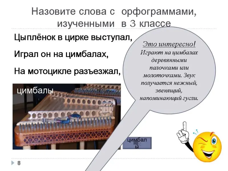 - Это интересно! Цимбалы - музыкальный струнный инструмент. Играют на цимбалах деревянными палочками. Звук получается нежный, звенящий, напоминающий гусли.
