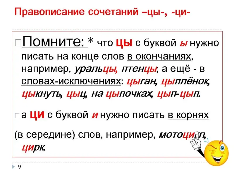 Слайд 9. Правописание сочетаний -цы-, -ци-. Вспомним правило: