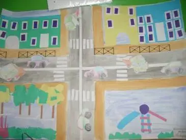 Цель: повторить понятие «перекресток», «зебра», «пешеходный переход»; учить рисовать дома разной этажности, машины, пересечение дорог, правильно расставлятьдорожные знаки на перекрестке, аккуратно рисовать, дружно выполнять работу.