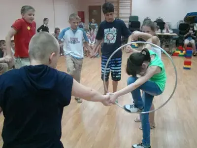 Команда встает в круг и берется за руки. На руке у капитана висит обруч. Не разрывая рук, все должны пролезть сквозь обруч по кругу и вернуть его капитану. Капитан, получив обруч, поднимает его над головой.