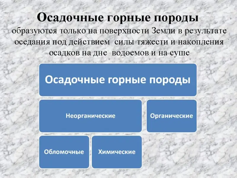 Осадочные горные породы. Эти породы, в отличие от магматических, образуются только на поверхности Земли в результате оседания под действием силы тяжести и накопления осадков на дне водоемов и на суше. В основном они мягкие и легко разрушаются. Осадочные горные породы бывают органические и неорганические.