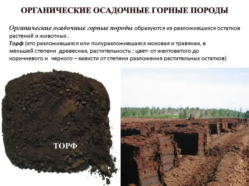 Органические осадочные горные породы состоят в основном из остатков растений, животных, накопившихся за миллионы лет на дне озер, морей и океанов. Это горючие полезные ископаемые (каустобиолиты) - торф, каменный уголь, нефть, природный газ, а также мел, известняки, состоящие из скопления остатков скелетов морских животных. Для этих пород характерна слоистость. В пластах можно найти остатки и отпечатки растений и животных.