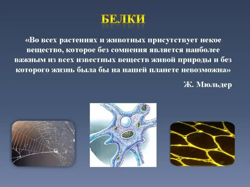 1. Белки (Слайд 3). Изучение белка начинаем с высказывания биохимика Ж. Мюльдера "Во всех растениях и животных присутствует некое вещество, которое без сомнения является наиболее важным из всех известных веществ живой природы и без которого жизнь была бы на нашей планете невозможна".