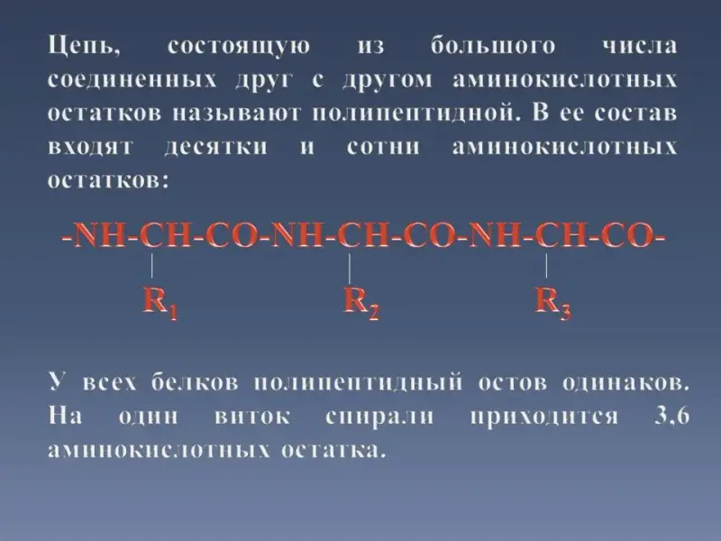 19 Слайд. Цепь, состоящую из большого числа соединенных друг с другом аминокислотных остатков называют полипептидной. В ее состав входят десятки и сотни аминокислотных остатков. У всех белков полипептидный остов одинаков. На один виток спирали приходится 3,6 аминокислотных остатка.