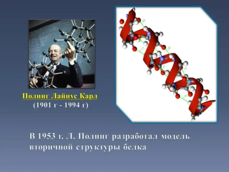 Слайд 26. В 1953 г. Л. Полинг разработал модель вторичной структуры белка. В 1954 году ему была присуждена Нобелевская премия по химии. В 1962 году - Нобелевская премия мира.