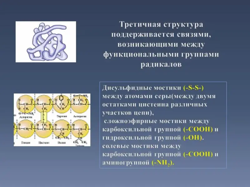 Слайд 28. Третичная структура поддерживается связями, возникающими между функциональными группами радикалов - дисульфидные мостики (-S-S-) между атомами серы (между двумя остатками цистеина различных участков цепи), - сложноэфирные мостики между карбоксильной группой (-COOH) и гидроксильной группой (-OH), - солевые мостики между карбоксильной группой (-COOH) и аминогруппой (-NH2). По форме белковой молекулы, которая определяется третичной структурой, выделяют глобулярные белки (миоглобин) и фибриллярные (кератин волоса), которые выполняют в организме структурную функцию.