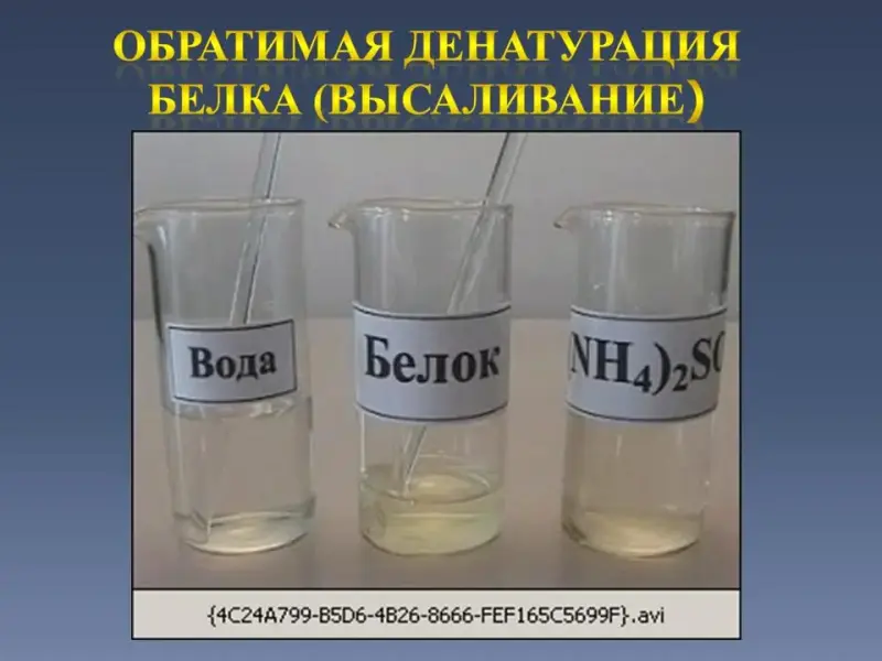 Слайд 33. Опыт №1. Обратимая денатурация белка. К раствору белка добавляют насыщенный раствор сульфата аммония. Раствор мутнеет. Произошла денатурация белка. В пробирке осадок белка. Этот осадок можно опять растворить если несколько капель мутного раствора добавить в воду и раствор помешать. Осадок растворяется.