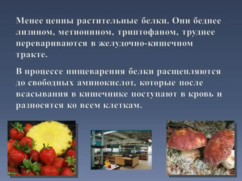 46 Слайд. Менее ценны растительные белки. Они беднее лизином, метионином, триптофаном, труднее перевариваются в желудочно-кишечном тракте.