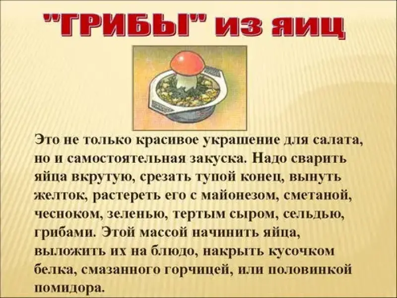 Это не только красивое украшение для салата, но и самостоятельная закуска. Надо сварить яйца вкрутую, срезать тупой конец, вынуть желток, растереть его с майонезом, сметаной, чесноком, зеленью, тертым сыром, сельдью, грибами. Этой массой начинить яйца, выложить их на блюдо, накрыть кусочком белка, смазанного горчицей, или половинкой помидора.