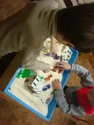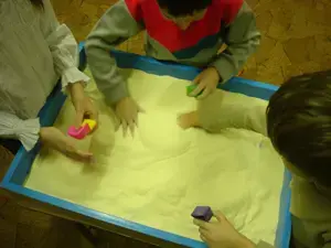 - "Сказка в песке" - ребенку предлагается самому придумать небольшую сказку, используя героев и предметы из Киндер-сюрприза.