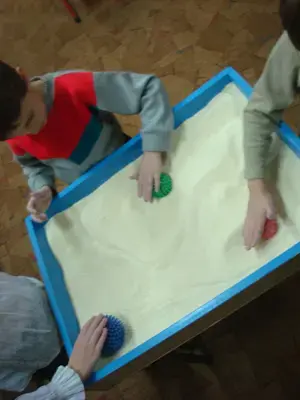 - Самомассаж рук с использованием массажного мячика - катаем мячик по песку вперед- назад, влево-вправо, по кругу. Выполняем сначала ведущей рукой, потом ведомой, а затем двумя руками одновременно.
