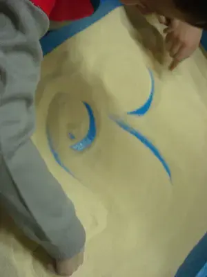 - "Узоры" - на песке нарисована часть узора, ребенку необходимо продолжить узор слева направо и в обратном направлении, или сверху вниз и в обратном направлении. Движения выполняются ведущей, а затем ведомой рукой.
