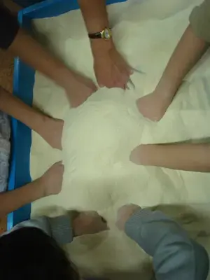 - "Клубок" - Бабушка наматывает клубок ниток - из центра песочницы выполняем спиральные движения по песку, как бы наматываем клубок. Бабушка разматывает клубок - от одного из бортов песочницы выполняем спиральные движения к центру.