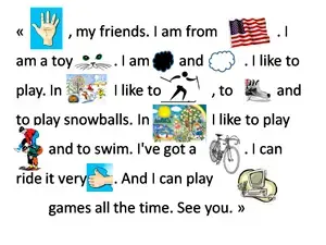 "Hello, my friends. I am from America. I am a toy cat. I am black and white. I like to play. In winter I like to ski, to skate and to play snowballs. In summer I like to play leap-frog and to swim. I've got a bike. I can ride a bike very well. And I can play computer games all the time. See you. "