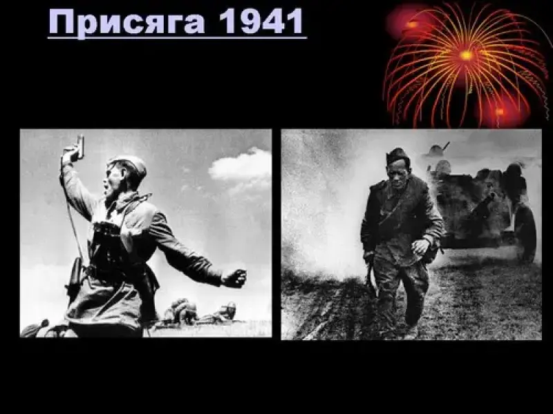 Для открытия видео №1, сделать щелчок по надписи на слайде №15 "Присяга 1941".
