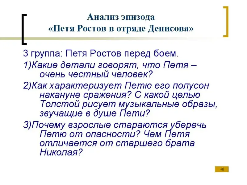 В своей статье «Портрет Пети Ростова» Н.Г. Долинина, русская писательница, так представила героя романа: «… мы видели его с первых страниц: толстый маленький мальчик, поспоривший с Наташей, что на именинном обеде она задаст свой отчаянно-весёлый вопрос о пирожном; он вертелся вокруг Николая и Денисова, приехавших в отпуск, как всякий мальчишка, который восхищается старшим братом-военным; но мы всё ещё не замечали его: он маленький…» [3]. Каким Вам представляется маленький Петя? Достаточно ли той информации, что даёт нам Толстой о нём, чтобы создать полноценный образ Пети-ребёнка? (Презентация, слайд № 5). В каких эпизодах начинает раскрываться характер Пети Ростова? Какие черты характера присущи ему? (Презентация, слайд № 6).