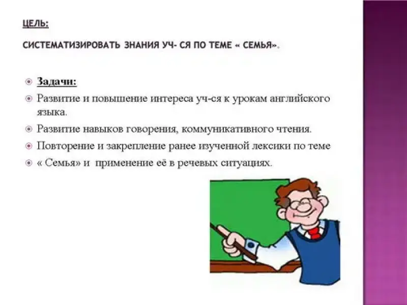 - Повторение и закрепление ранее изученной лексики по теме "Семья" и применение её в речевых ситуациях.