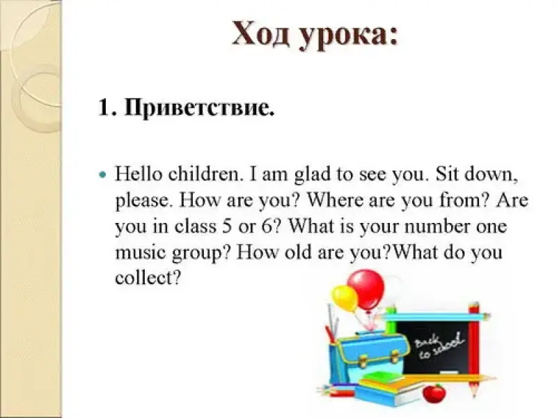 | Организационный (приветствие) | Демонстрационная презентация | Создание рабочего настроя, проверка готовности, повторение грамматической структуры вопроса и ответа на него. |