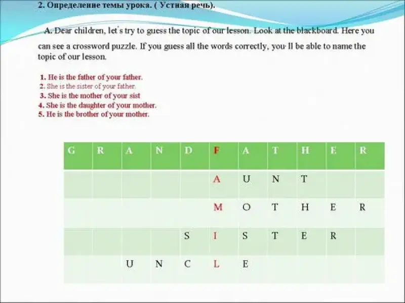 А. Dear children, let's try to guess the topic of our lesson. Look at the blackboard. Here you can see a crossword puzzle. If you guess all the words correctly, you, ll be able to name the topic of our lesson.