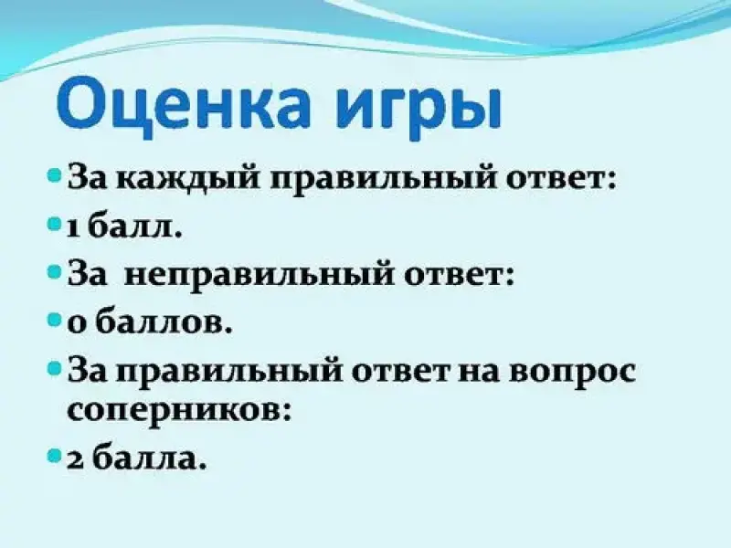 - За правильный ответ на вопрос команды соперников: 2 балла.