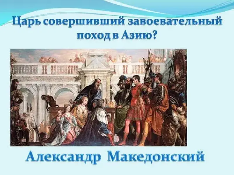 - Царь, совершивший завоевательный поход в Азию? (А. Македонский).
