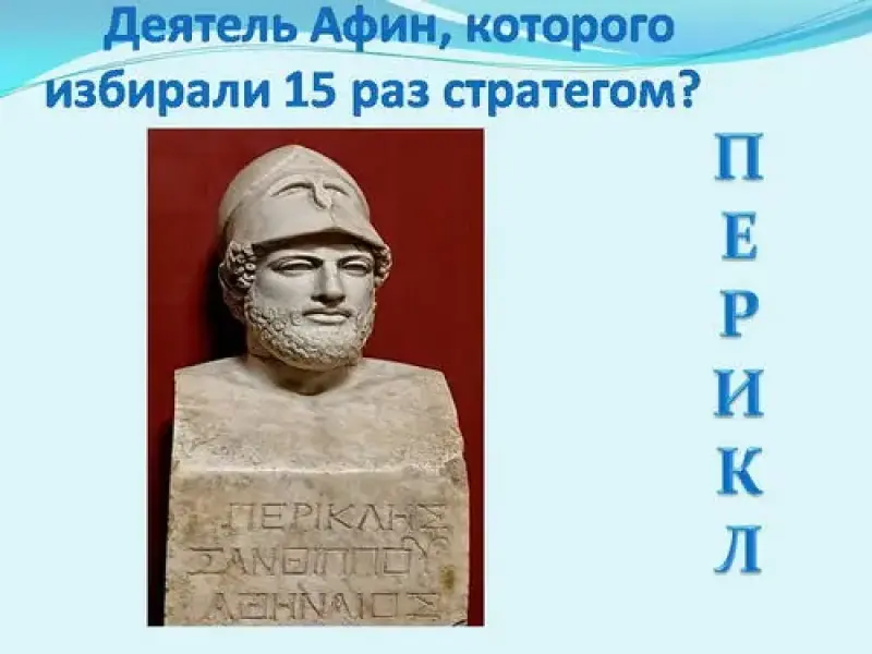 - Деятель Афин, которого избирали 15 раз стратегом? (Перикл).)