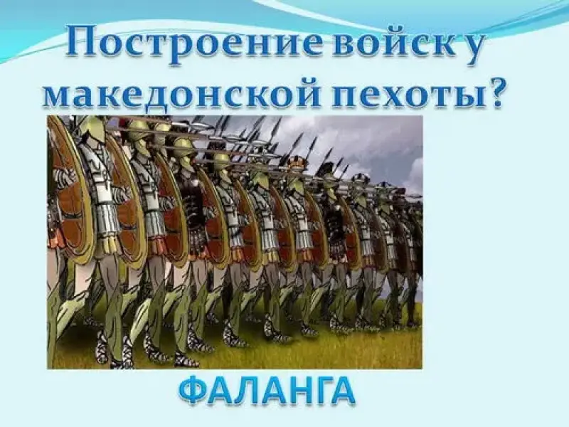 - Построение войск у македонской пехоты? (Фаланга)